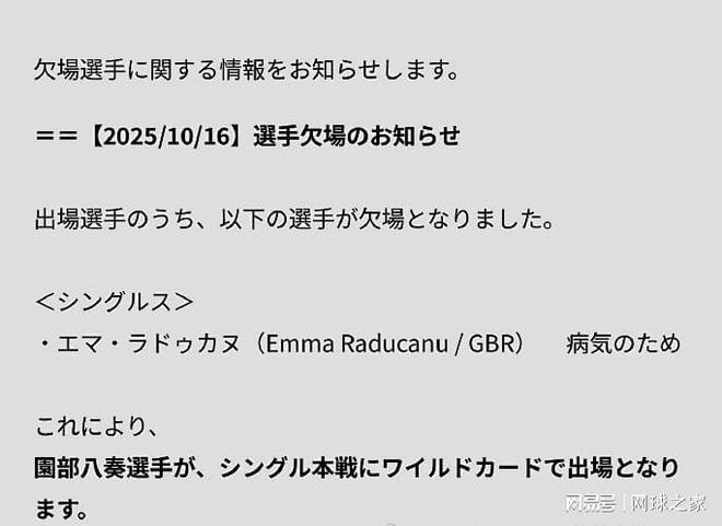 我們再來關(guān)注球員動態(tài)。北京時間昨晚,WTA500東京站官宣,英國一姐拉杜卡努因病退出了將于下周開打的這站比賽。祝拉杜早日康復(fù)吧!
