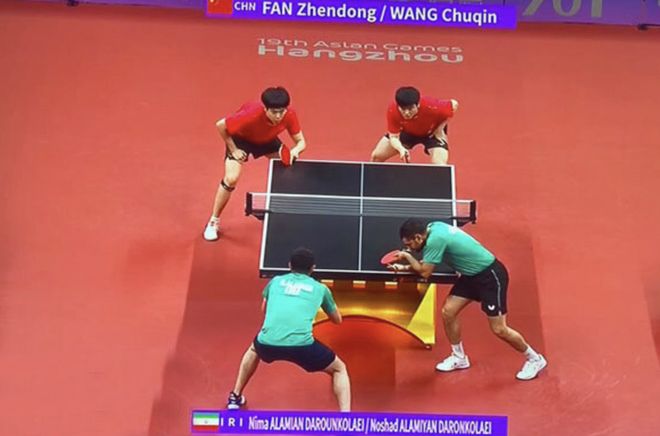 在2023年的杭州亞運會上,伊朗爆出驚天大冷門,男團項目的8強比賽中,伊朗隊以3:0的成績擊敗擁有張本智和,戶上隼輔,吉村真晴的日本隊,時隔65年再度闖進亞運會xian'z決賽,并拿下一枚銅牌。不僅如此,他們的阿拉米揚/阿拉米安的男雙組合,也成功闖進半決賽,0:4負于中國隊樊振東和王楚欽的組合。