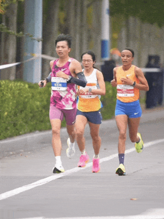 起跑時,黃雪梅依舊跟丈夫陳志明一起搭檔。鳴槍出發(fā)后,陳志明以329-331的配速帶著黃雪梅。陳志明一直以此配速維持到半程。在這期間,跟隨黃雪梅跑的一位外籍選手也中途掉速,沒在一起跑。