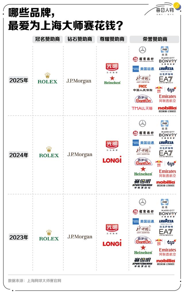 連續(xù)走高的熱度也體現(xiàn)在贊助招商上。2024年的中網(wǎng)首次實(shí)現(xiàn)了主要贊助商席位滿額,到了2025年,“1個(gè)首席贊助商+3個(gè)鉆石贊助商+8個(gè)白金贊助商”的主要贊助商矩陣不僅接近滿員,招商總額也超越去年,達(dá)到新高。